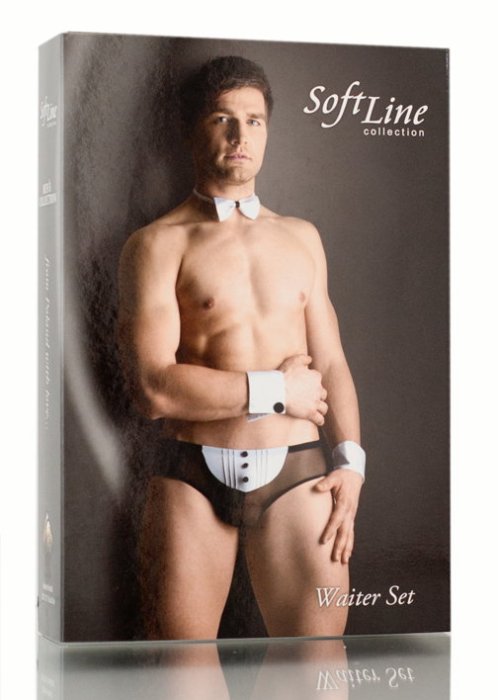 Костюм Официант , мужской , трусы-шорты, ткань- эластичная сетка,манжеты атласные на черных пуговицах, галстук- бабочка , размер M/L.
